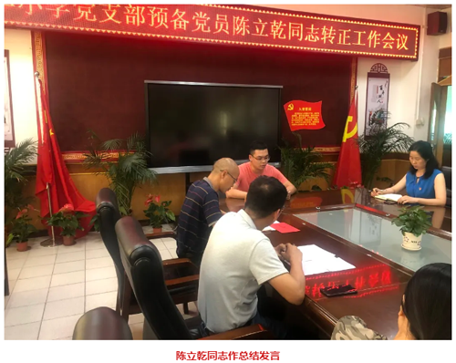 7月10日,永豐小學(xué)黨支部的全體黨員在學(xué)校會議室召開預(yù)備黨員轉(zhuǎn)正大會,討論陳立乾同志的轉(zhuǎn)正問題,會議由黨支部組織委員鄧源強同志主持。