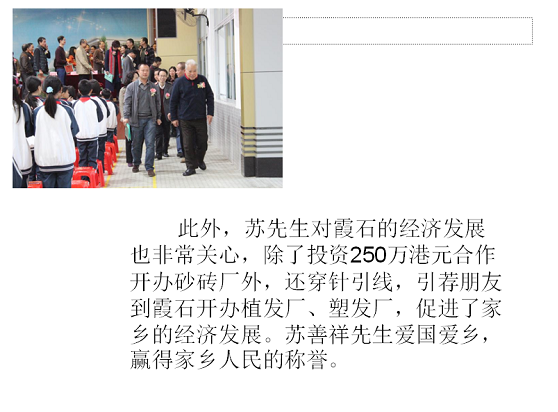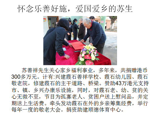 班會(huì)課上,同學(xué)們了解到善祥先生是一位樂善好施、受人尊敬的企業(yè)家,多年來一直為家鄉(xiāng)建設(shè)與教育事業(yè)作出巨大的貢獻(xiàn)。多年來,他共捐贈(zèng)港幣300多萬(wàn)元支持家鄉(xiāng)建設(shè)。為了促進(jìn)家鄉(xiāng)的經(jīng)濟(jì)發(fā)展,他不僅投資250萬(wàn)港元合作開辦砂磚廠,還穿針引線,引薦身旁朋友到霞石投資設(shè)廠;為了敬老尊老,他興建敬老院,并每年?duì)款^發(fā)動(dòng)霞石在外的鄉(xiāng)親籌集經(jīng)費(fèi),舉行每年一度的敬老大會(huì);為了發(fā)展教育,他投資興建了霞石善祥學(xué)校和霞石幼兒園,舉辦獎(jiǎng)教獎(jiǎng)學(xué)大會(huì),獎(jiǎng)勵(lì)認(rèn)真讀書的學(xué)生和勤奮的老師們,關(guān)注霞石學(xué)子的成長(zhǎng)。這位可愛的老人對(duì)家鄉(xiāng)的感情深厚,總是想方設(shè)法地為鄉(xiāng)親們做著一件件力所能及的事情,他無(wú)私的大愛,贏得了村民對(duì)他的敬佩和贊頌。