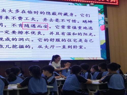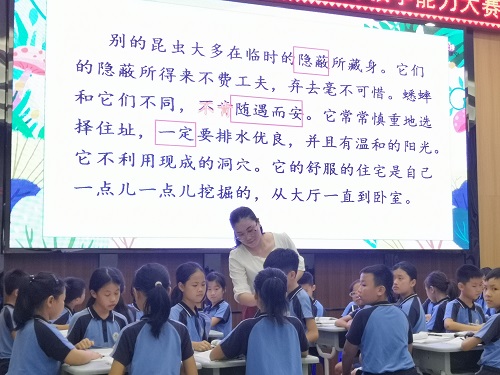下午的第二場(chǎng)課堂展示環(huán)節(jié),張小語老師給在場(chǎng)評(píng)委和老師們帶來了有趣生動(dòng)的《蟋蟀的住宅》一課。張老師先從其他動(dòng)物的家入手,引出蟋蟀的住宅;緊接著帶領(lǐng)學(xué)生從具體語句領(lǐng)略蟋蟀住宅的外部特點(diǎn)、內(nèi)部設(shè)置等特點(diǎn),感受蟋蟀住宅是一項(xiàng)偉大的工程。最難能可貴的是,張老師引導(dǎo)學(xué)生品析句子,并能針對(duì)性的給予指導(dǎo),反復(fù)朗讀,細(xì)細(xì)品味,讓學(xué)生在關(guān)鍵詞的誦讀中體會(huì)蟋蟀住宅的偉大。在老師的啟發(fā)引導(dǎo)下,學(xué)生主動(dòng)探究,大膽質(zhì)疑,積極思考。