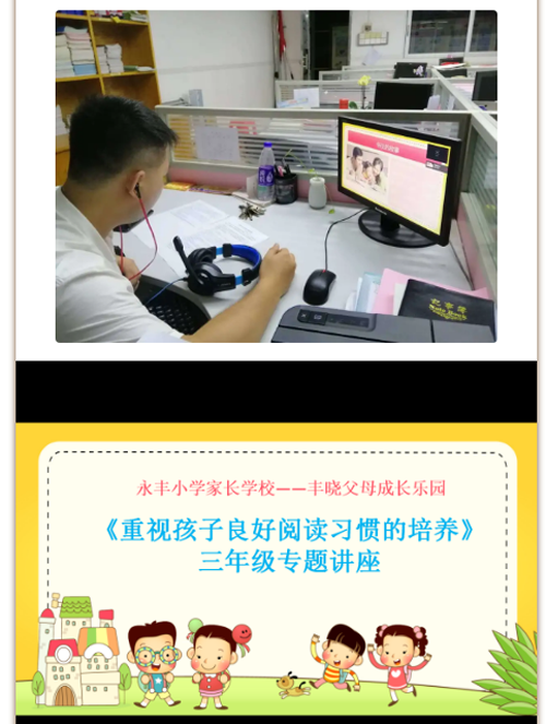 第二部分是由三四年級(jí)級(jí)長(zhǎng)利用直播直播平臺(tái)開展線上年級(jí)主題講座培訓(xùn)。三年級(jí)由梁嘉豪老師圍繞“怎樣培養(yǎng)孩子的良好閱讀習(xí)慣”和“為什么要重視培養(yǎng)孩子良好的閱讀習(xí)慣”開展《重視孩子良好閱讀習(xí)慣的培養(yǎng)》年級(jí)主題講座培訓(xùn)。