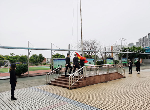 空曠的操場(chǎng)上,莊重如常。張永新校長(zhǎng)和行政團(tuán)隊(duì)分別擔(dān)任本次儀式的升旗手和護(hù)旗手,步伐整齊劃一。