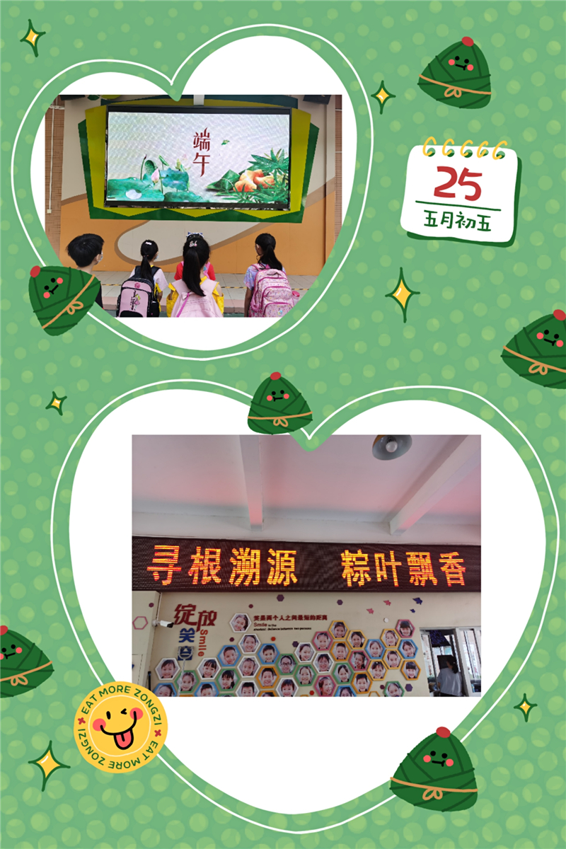 校園內(nèi),大隊部利用升旗儀式和LED大屏幕宣傳欄,積極營造濃厚的宣傳氛圍,追溯端午淵源,宣傳端午節(jié)的文化與習(xí)俗,讓學(xué)生充分了解“端午節(jié)”的有關(guān)知識。