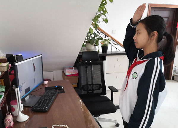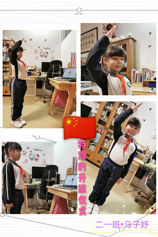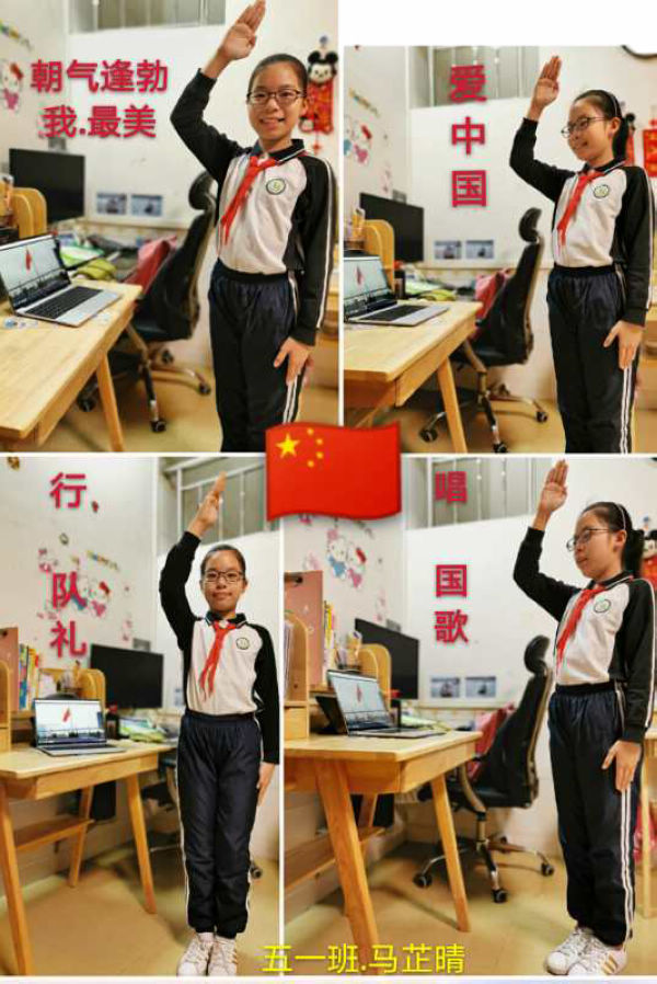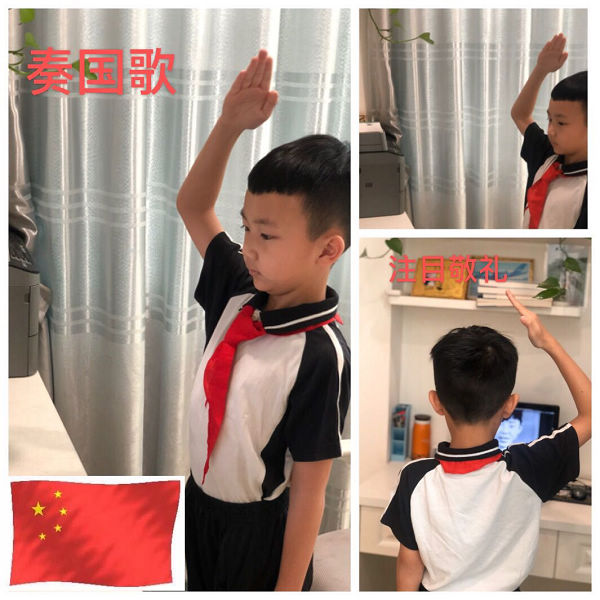 “升國(guó)旗、奏唱國(guó)歌,敬禮”,鮮艷的五星紅旗冉冉升起,奮發(fā)的少先隊(duì)員們敬著標(biāo)準(zhǔn)的隊(duì)禮,鏗鏘的國(guó)歌奏響在全校師生家里,滾燙的愛國(guó)之情在每一位心中升騰.......這一刻,我們雖身處不同地方,但我們都懷揣著一顆熾熱的赤子之心,共同祈愿能早日回歸等待了我們?cè)S久的校園!
