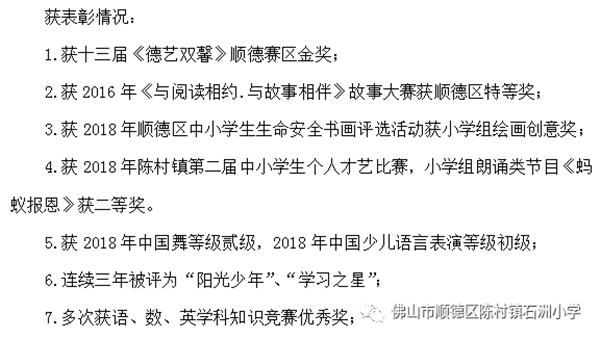仇賢斌同學(xué)學(xué)習(xí)興趣廣泛,樂于助人,關(guān)心集體,是老師的得力助手。他撰寫的征文在廣東省“我和我的祖國”主題教育活動(dòng)中獲得三等獎(jiǎng);曾獲順德區(qū)“我的校園我的家”微征文比賽人氣獎(jiǎng);陳村鎮(zhèn)科技創(chuàng)新大賽科幻繪畫比賽獲一等獎(jiǎng);石洲村小學(xué)生繪畫比賽三等獎(jiǎng);連續(xù)4年被學(xué)校評(píng)為“陽光少年”、“陽光班干部”。