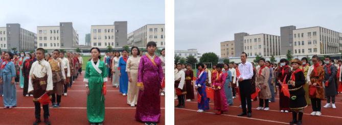 校園內(nèi)紅旗飄揚(yáng),肅穆莊嚴(yán),升旗手身穿禮服,西藏班同學(xué)身著民族服裝,在莊嚴(yán)的國(guó)歌聲中,目送著鮮艷的五星紅旗冉冉升起。