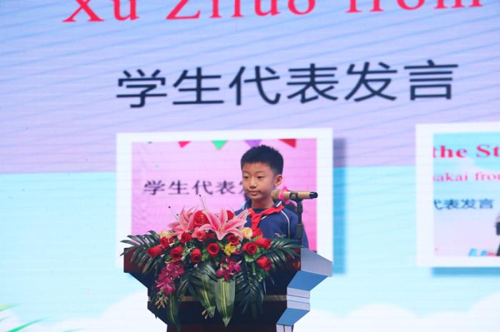 表演結(jié)束后,三年(8)班徐梓洛同學(xué)作為英語特色班代表發(fā)言。他用流利的英語跟大家分享了在本次英語嘉年華中的收獲以及學(xué)習(xí)英語的心得體會(huì),表達(dá)了對(duì)英語的喜愛之情,感謝學(xué)校提供的英語特色課程讓他的英語學(xué)習(xí)之路變得多姿多彩。同時(shí)他希望自己能夠帶著一口流利的英語環(huán)游世界與世界各地的人交朋友,向他們介紹我們國家,開啟在英語世界的多彩夢(mèng)想。
