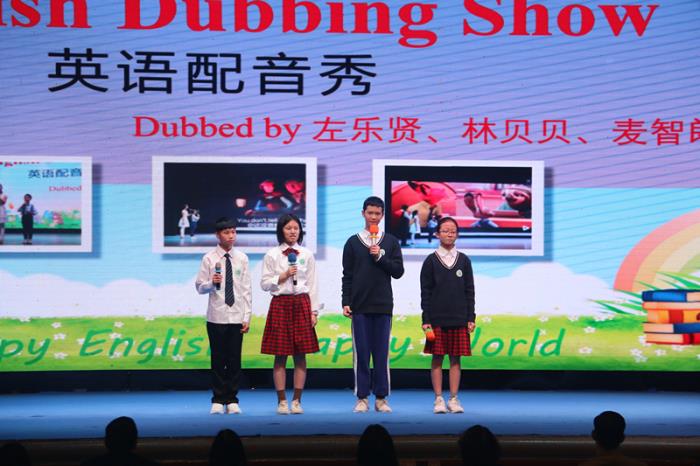 最后,初中英語特色班左樂賢、林貝貝、麥智朗、葉欣桐四位同學(xué)為動(dòng)畫電影《冰雪奇緣》、《怪獸公司》配音,該節(jié)目配妙趣橫生,配音演員們?cè)谂_(tái)上仿佛與角色融為了一體。他們用自己的聲音和語言在舞臺(tái)上精彩還原了電影中的人物性格特色,一人分飾兩角,將電影中角色的聲音模仿的活靈活現(xiàn)。嫻熟的英語發(fā)音、抑揚(yáng)頓挫的情感節(jié)奏,讓場(chǎng)下的觀眾們?nèi)缗R其境,掌聲不斷。