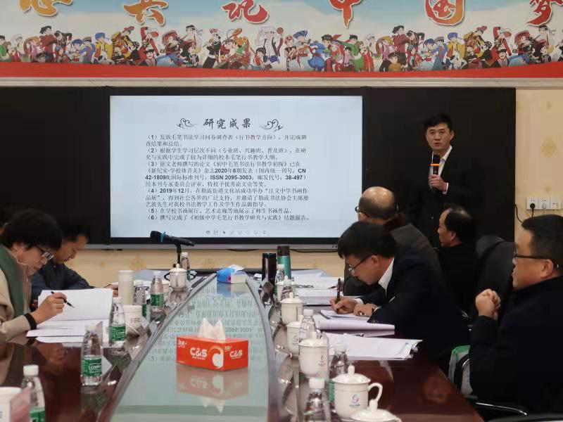 主持人金銀紅主任介紹本次論證會的議程和與會專家后,由徐文向與會專家匯報他主持的區(qū)立項小課題《初級中學(xué)毛筆字行書教學(xué)研究與實踐》。徐文老師重點(diǎn)向與會專家匯報了研究成果。