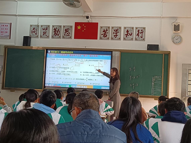 課堂上周偉萍老師從基礎(chǔ)考點過關(guān)開始,從常考知識點與學(xué)生循循善誘,語言親切,讓學(xué)生如沐春風(fēng),學(xué)生如在和風(fēng)暖陽中收獲知識。之后用思維導(dǎo)圖進(jìn)行歸納。而后通過重難點突破中的用希沃白板的函數(shù)技術(shù)對反比例函數(shù)幾何性質(zhì)進(jìn)行動態(tài)演示,最后點亮廣東省中考壓軸題的反比例函數(shù)的思維火花,使數(shù)學(xué)課堂與信息技術(shù)高度相融合。陽山老師聽完課后不經(jīng)意間脫口而出的“厲害”道出所有老師的聽課心聲。