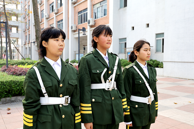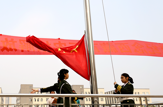 升旗儀式上,全體師生奏唱國歌,行莊嚴的注目禮。