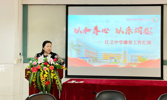在匯報(bào)工作中,江義中學(xué)周霞副校長(zhǎng)作了題為“以和養(yǎng)心,以樂(lè)潤(rùn)德”的德育工作匯報(bào)。她從管理機(jī)制、心育工作、德育課程和創(chuàng)新工作這四個(gè)方面進(jìn)行匯報(bào)。