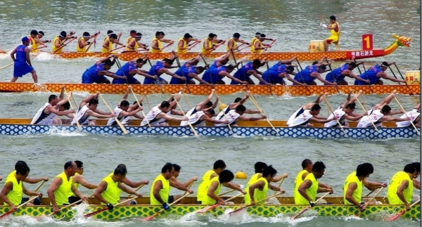 賽龍舟能夠說是端午節(jié)的高潮。龍舟長10米多,以龍頭和龍尾作裝飾,船身還特意雕上麟狀花紋,唯妙唯肖;每只龍舟可容納20至22人,二人并肩而坐,在船首的鼓手和船尾的舵手引領(lǐng)下,以及圍觀人群的吶喊聲中劃向終點。