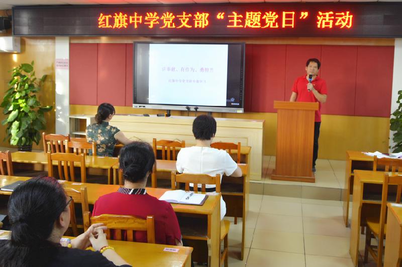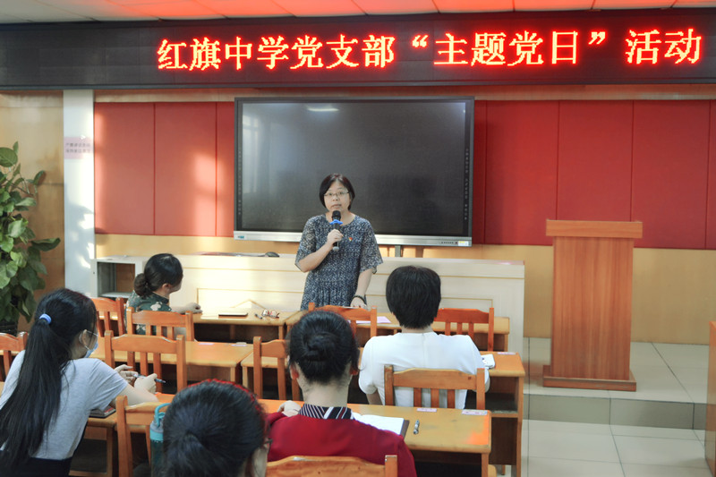 活動在雄壯的國歌聲中拉開了序幕。隨后,紅旗中學黨支部書記陳亞玲同志帶領支部全體黨員重溫入黨誓詞,感悟黨的使命,進一步強化初心和責任擔當。首先表彰了2020年上半年在教育教學、創(chuàng)先爭優(yōu)、防疫抗疫工作中表現(xiàn)突出的黨員干部,并進行了現(xiàn)場頒獎。