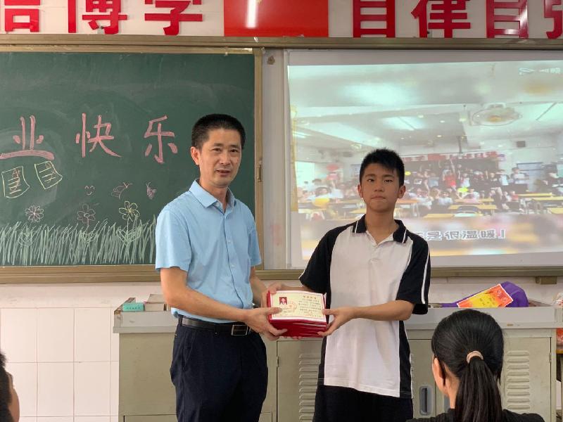 在即將離開母校的時(shí)刻,全體畢業(yè)生再一次聆聽可親可敬的曾校長殷殷囑托:“記得六年前校園繽紛落葉,難忘畢業(yè)季七月似火驕陽。為了你們心中的遠(yuǎn)方,南環(huán)用最溫暖的目光相送……你們的童年與南環(huán)有最美的相遇!同學(xué)們,你們每個(gè)人都收到了學(xué)校發(fā)放的《畢業(yè)季留言紀(jì)念冊》,打開它,同學(xué)們就看到了八個(gè)大字:‘追逐夢想,不負(fù)韶華’,‘韶華’是最美好的時(shí)光,請你們努力奮進(jìn),不負(fù)你們最美好的時(shí)光!” 隨后,曾校長鄭重地為學(xué)生代表們頒發(fā)畢業(yè)證書。六年來,陪著孩子們一同成長,一路收獲的老師們也來見證孩子們的幸福時(shí)光。這是一群不忘初心,獻(xiàn)身教育的老師們!