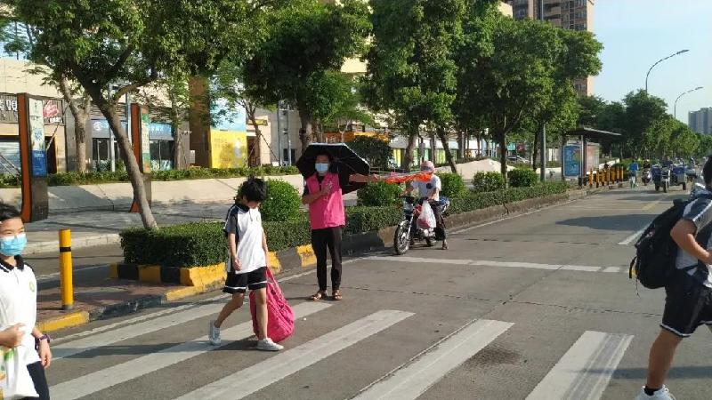 義工隊一百多人,每周五天的堅守,架鐵馬、拉雪糕桶,站在斑馬線的兩端,站在車水馬龍之間,這不是一尊肉體,而是一座城墻。最難難在盲區(qū)拐角――不聽指揮的車輛強行將孩子放下;難在城光匯景的紅綠燈處――有車輛不顧綠燈強行通過。義工朋友義無反顧,交通管理紅旗一甩起,小小的身軀立出去。守衛(wèi)著容里小學(xué)全校師生的安全。