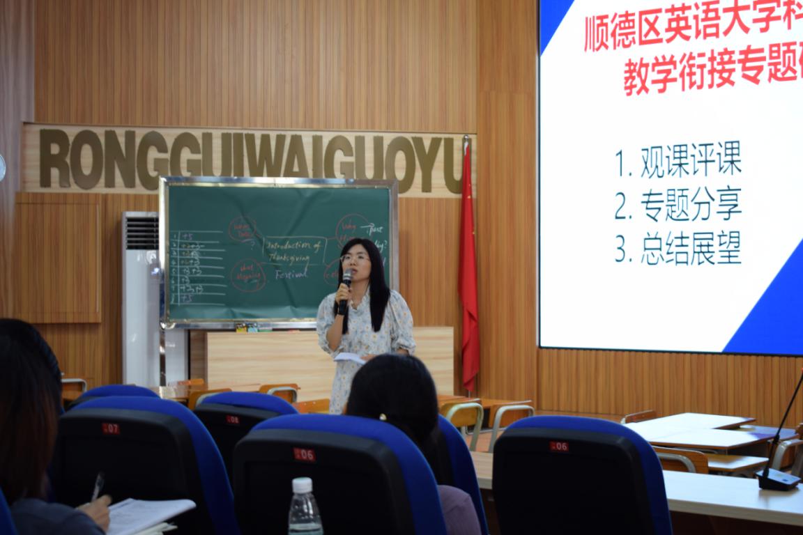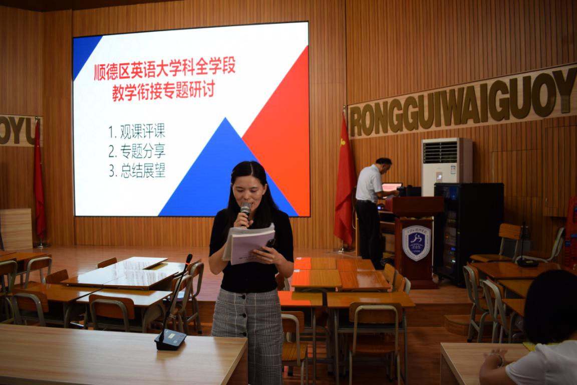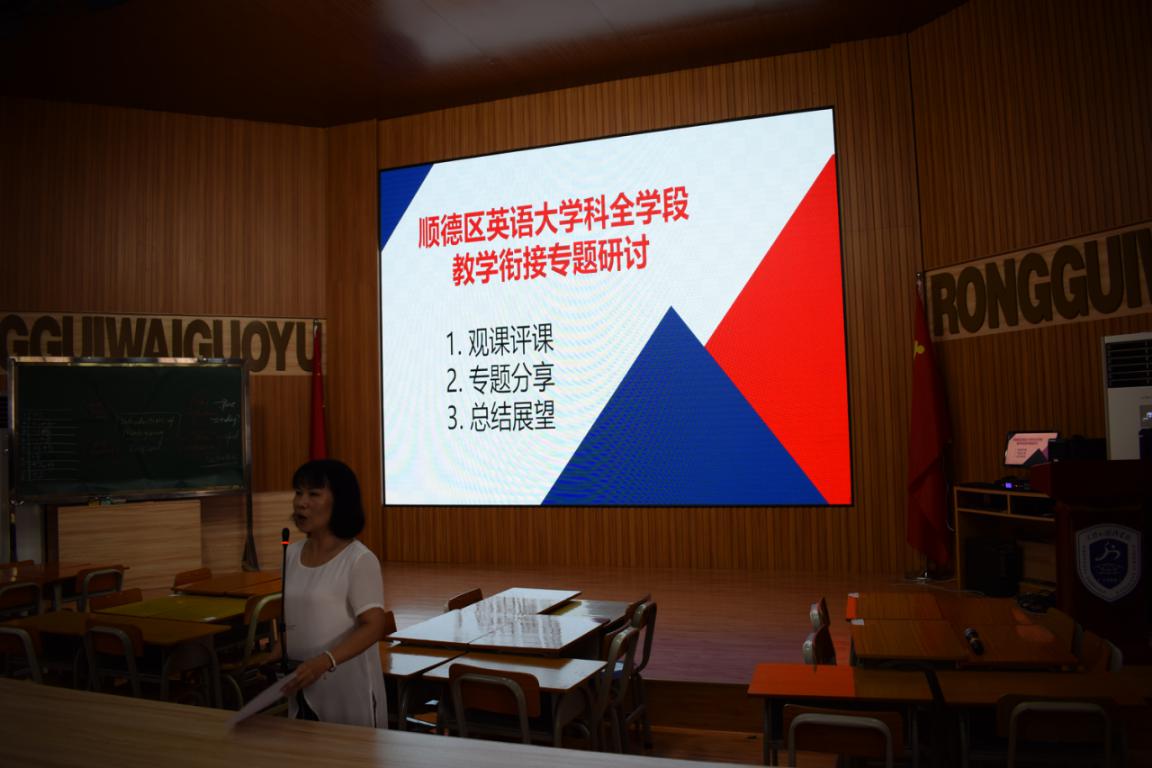 為了總結(jié)上學年英語學科大教研工作經(jīng)驗,研討并部署新學期教研工作,積極推進區(qū)域聯(lián)合教研,形成學科內(nèi)學段銜接的大教研機制和各級各類教研合力,9月8日下午,本學期英語學科大教研工作會議于容桂外國語學校召開,順德區(qū)教育發(fā)展中心教研員田湘軍、杜曉曦、許莎莎,容外副校長周劍山,以及來自不同鎮(zhèn)街和學校的英語科組長,各年級備課組長參加了會議。會議由容桂外國語學校英語科組長楊通蘭主持。
