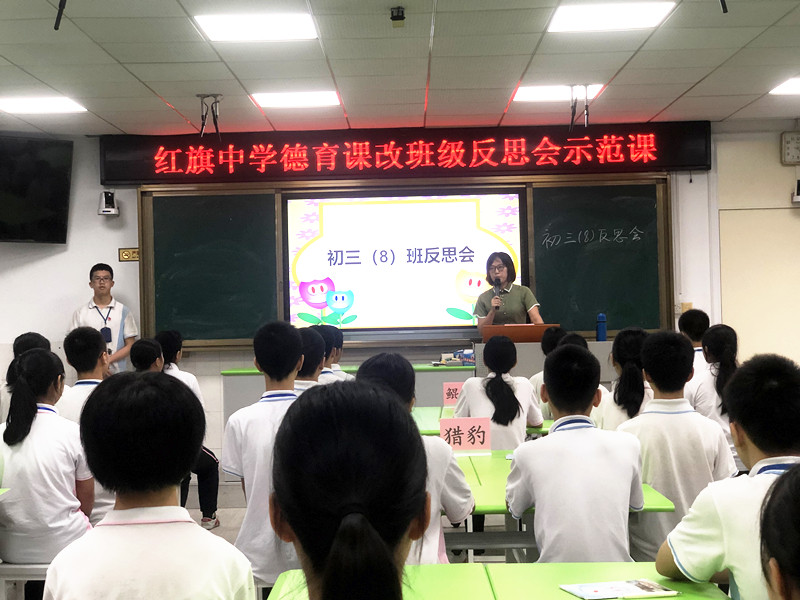 反思會(huì)示范課在初三8班同學(xué)熱烈響亮的班級(jí)誓詞宣讀中拉開了序幕。展示活動(dòng)由學(xué)生主持,并依次按照班干部事務(wù)點(diǎn)評(píng)、組長總結(jié)、我建議、我表揚(yáng)、我反思等課堂流程循序開展,規(guī)范進(jìn)行。參與活動(dòng)展示的學(xué)生積極參與、自信大方、善于思考和質(zhì)疑,展現(xiàn)了優(yōu)秀的個(gè)人風(fēng)采和班級(jí)風(fēng)貌。最后,班主任譚老師的精彩點(diǎn)評(píng)更是將活動(dòng)推向了高潮。