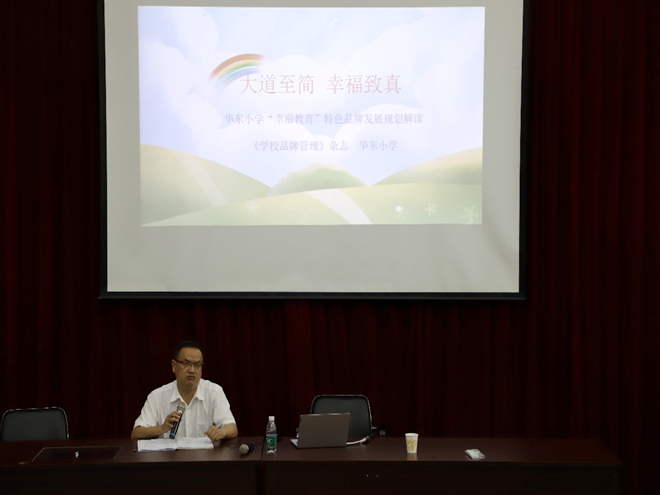 《學校品牌管理》雜志的謝老師從學校發(fā)展背景出發(fā),以戰(zhàn)略的高度解讀了締造“幸福教育”的緣由、涵義、精神文化系統(tǒng)、課程體系,升華了“幸福教育”的理論依據(jù)和指導思想;再對校園文化、課堂教學、幸福教育的活動和教師隊伍建設(shè)等方面進行了具體方法的闡述;最后進行了華東小學幸福教育頂層設(shè)計系統(tǒng)的解讀。