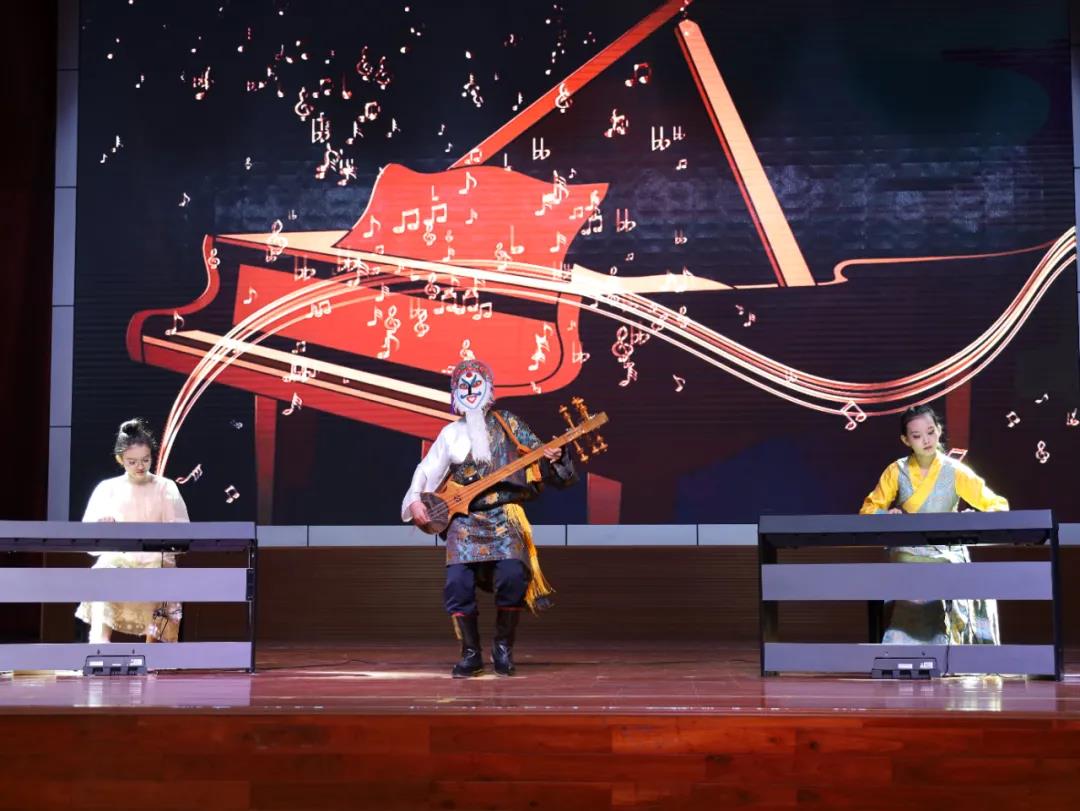 第二篇章是相知相愛一家親。古箏彈唱是我校的特色,趙穎蕊、黃婷、鄒鈺琪同學(xué)用細(xì)細(xì)的琴弦演繹廣東人民戰(zhàn)臺風(fēng)的故事,表現(xiàn)人民與自然作斗爭的不屈風(fēng)貌。