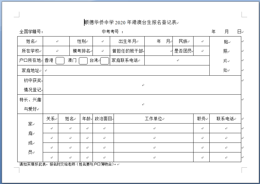 一、報考條件和要求 (一)報考必達條件 具有順德區(qū)學(xué)籍并具備以下條件之一的應(yīng)屆初中畢業(yè)生: 1、港澳地區(qū)考生,具有香港或澳門居民身份證和《港澳居民來往內(nèi)地通行證》; 2、臺灣地區(qū)考生,具有在臺灣居住的有效身份證明和《臺灣居民來往大陸通行證》; 考生所持證件必須在有效期限之內(nèi),且有效期須達2023年6月。 (二)報考要求 達到報名條件的港澳臺籍應(yīng)屆畢業(yè)學(xué)生,須參加2020年佛山市初中畢業(yè)生學(xué)業(yè)考試和高中階段學(xué)校招生考試(即中考)。 二、招生人數(shù):45人 三、錄取辦法 (一)報名 報名時間:2020年5月22日至6月3日 報名方式:網(wǎng)上報名 1. 將下面的報名材料打包發(fā)送至電子郵箱:648298028@qq.com 2. 微信掃碼碼進入順德華僑中學(xué)港澳臺班中招咨詢?nèi)海⑿薷娜好瑸?/span>“xx學(xué)校+姓名” 報名材料: 1、港澳地區(qū)考生,香港或澳門居民身份證和《港澳居民來往內(nèi)地通行證》掃描件; 2、臺灣地區(qū)考生,在臺灣居住的有效身份證明和《臺灣居民來往大陸通行證》掃描件; 3、完整填寫港澳臺生報名登記表(見附件)。 咨詢電話:22323905麥老師,22803565陳老師,13679727668潘老師 13316328928胡老師 ,15820692683涂老師 (二)面試 面試時間:2020年6月6日 面試報到時間:8:30―9:00 面試報到地點:華僑中學(xué)辦公樓四樓會議室 面試時間:9:00―11:30 面試要求:考生必須戴口罩參加面試,進校門時必須測溫、亮碼,顯示正常者方可進入校園,在面試等候區(qū)必須按前后左右至少1米的間距就坐。 (三)錄取 通過面試的考生,網(wǎng)上填報志愿時需在第二批第一層次中選填“華僑中學(xué)港澳臺生班”志愿;錄取時,區(qū)招生辦將根據(jù)考生志愿、中考文化科成績及招生計劃,由高分到低分投檔錄取。 順德區(qū)華僑中學(xué) 2020年05月22日