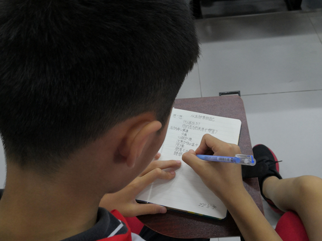 活動(dòng)中,譚醫(yī)生從“壓力與身心健康”和“如何從壓力中營救自己”兩方面給孩子們上了一節(jié)輕松愉快的心理健康課。孩子們積極參與并發(fā)表了自己的見解,也將譚醫(yī)生給出的建議認(rèn)真做好筆記。