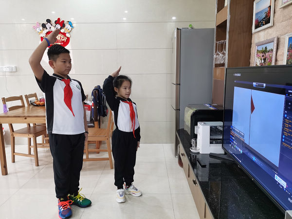 伴隨著雄渾激昂的國(guó)歌,鮮艷的五星紅旗在羅沙校園冉冉升起。升旗臺(tái)前,老師們衣著端莊,隊(duì)列整齊;電腦、手機(jī)屏幕前,師生、家長(zhǎng)們神情莊嚴(yán)肅穆,行禮,全體同時(shí)齊唱國(guó)歌。