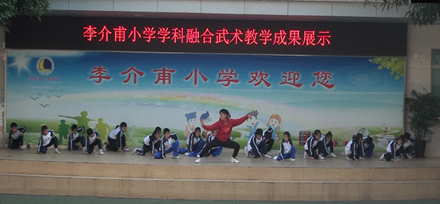 學(xué)科融合武術(shù)教學(xué)是基于李介甫小學(xué)“激揚(yáng)教育”的教育理念、探索學(xué)校武術(shù)文化建設(shè)在學(xué)生武術(shù)教育教學(xué)中的新路子,李介甫小學(xué)構(gòu)建了多層次的武術(shù)教學(xué)體系,將武術(shù)育人目標(biāo)融入到學(xué)校育人目標(biāo)體系中,通過(guò)開(kāi)展豐富的校園武術(shù)活動(dòng),實(shí)踐并創(chuàng)新“以武育人、以武養(yǎng)德”,整合學(xué)校武術(shù)教育資源,探索學(xué)校武術(shù)教育融入學(xué)校德育的途徑和方法。以武術(shù)為紐帶,拓展了綜合學(xué)科的整合,提高了武術(shù)育人的空間與品位。