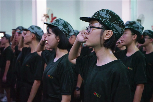 學(xué)生代表高一(1)班余瑤帶領(lǐng)全體學(xué)生進(jìn)行軍訓(xùn)宣誓,鏗鏘的誓言展現(xiàn)了容山學(xué)子戰(zhàn)勝困難、圓滿完成軍訓(xùn)任務(wù)的決心。