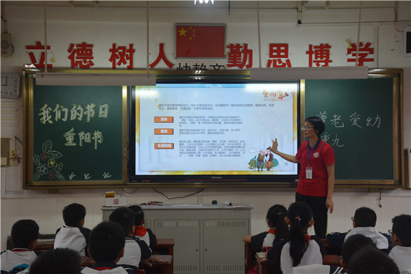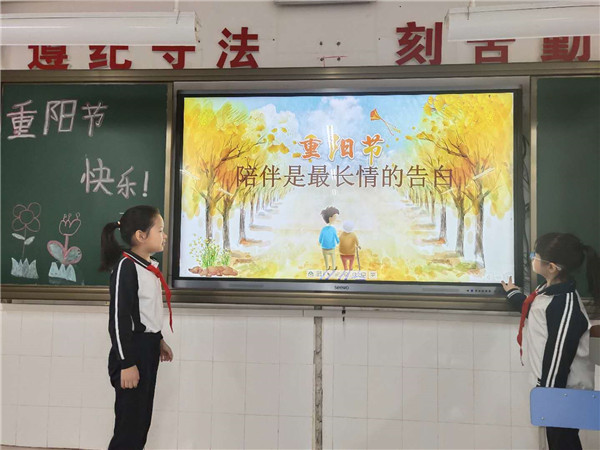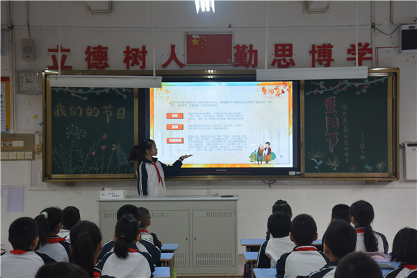 10月19日上午,各班還開展了“我們的節(jié)日?重陽”主題班會,向隊員們介紹中華傳統(tǒng)節(jié)日――重陽節(jié)的來歷、習(xí)俗等,并開展了主題為“情暖金秋,愛在重陽”的重陽誦讀活動。主題班會上,學(xué)生們不僅交流了對重陽節(jié)的了解,知道了重陽節(jié)的由來,別名和各地的風(fēng)俗,還誦讀了一些有關(guān)重陽節(jié)的詩句,讓中華優(yōu)秀傳統(tǒng)文化教育在校園里持續(xù)有效地進(jìn)行。