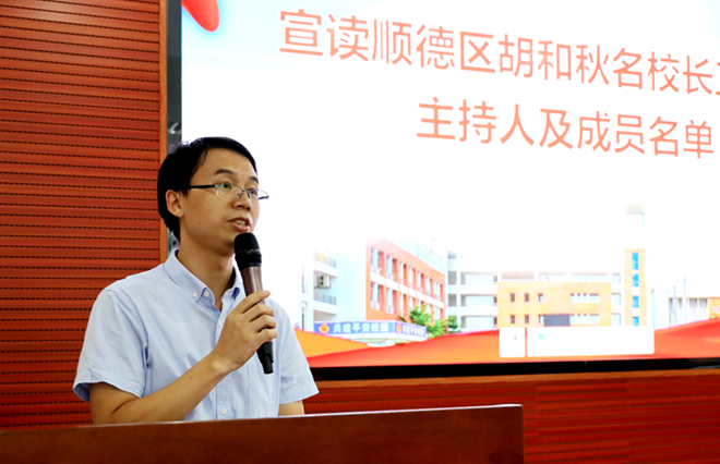 順德區(qū)教育發(fā)展中心教師發(fā)展研究室唐信焱主任宣讀順德區(qū)胡和秋名校長(zhǎng)工作室主持人及成員,并向他們頒發(fā)聘書(shū)。