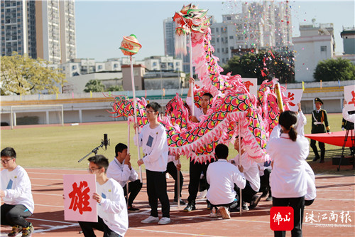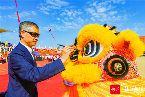 北外附校三水外國(guó)語(yǔ)學(xué)校領(lǐng)導(dǎo)為醒獅點(diǎn)睛。 /珠江商報(bào)記者朱德文攝