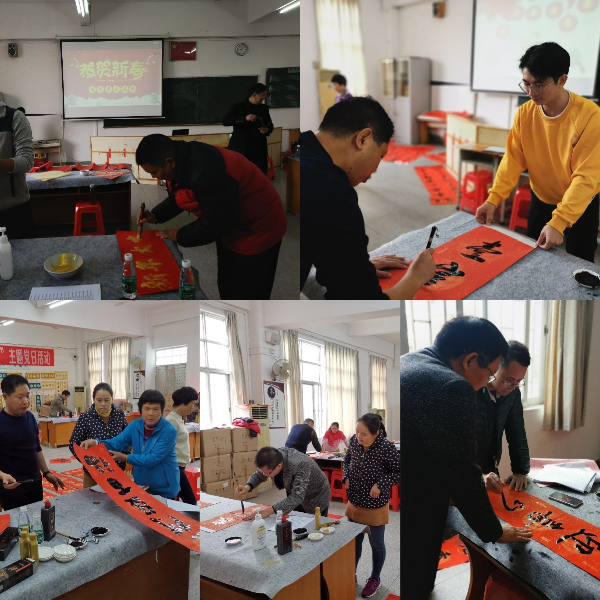 本次活動邀請了韓雨龍、鐘全榮、李華、王海平、鄧富華、劉建華等具有書法特長的黨員教師揮毫潑墨、送福迎新。工會委員提前精心準備了對仗工整、精煉喜慶的春聯(lián)集錦,供全校教職工選擇。