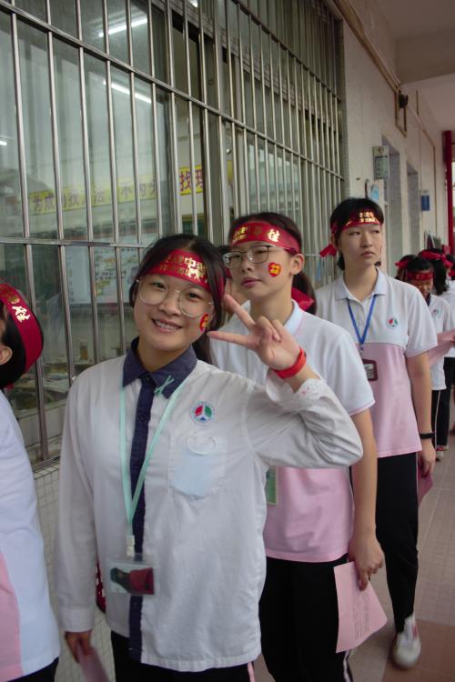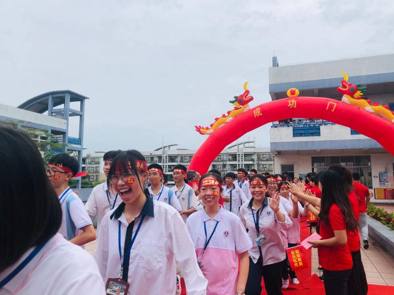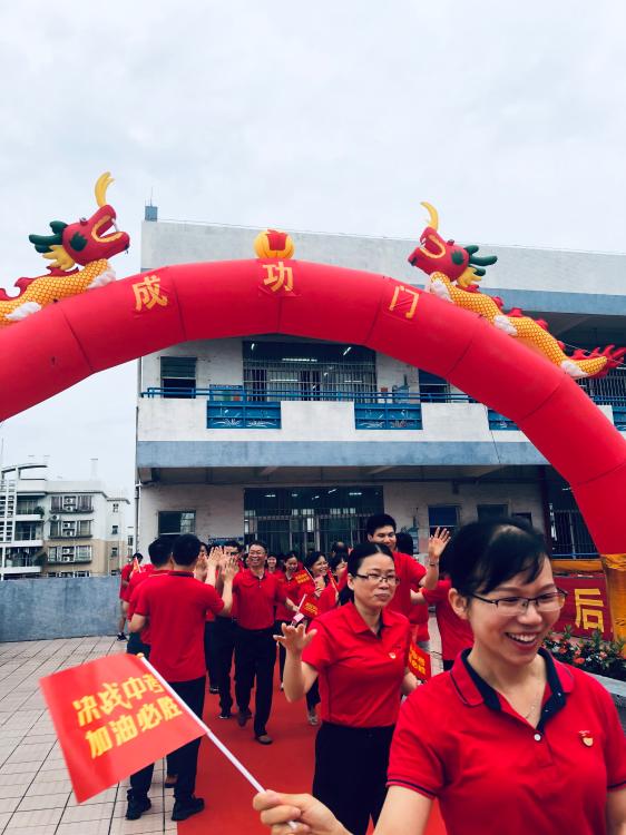 瞬時(shí),同學(xué)們那渴望而又激動(dòng)的眼神聚焦于“成功門(mén)”,仿佛那就是心之所盼的未來(lái)!各班的領(lǐng)隊(duì)同學(xué)都默默地緊握班旗的旗桿,在班主任的帶領(lǐng)下,同學(xué)們整理好額上的紅絲帶,邊氣勢(shì)如虹地高喊口號(hào)邊有序地走過(guò)“成功門(mén)”?!俺晒﹂T(mén)”兩側(cè)早有初三級(jí)的科任老師列隊(duì)靜候著,他們?yōu)槌跞龑W(xué)子搖旗吶喊,擊掌壯行,為這莊嚴(yán)的場(chǎng)面增添了一份溫情!