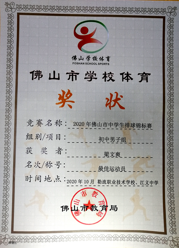 2020年10月30日至11月1日,由佛山市教育局主辦,順德區(qū)教育局承辦,順德區(qū)勒流江義中學和順德區(qū)勒流職業(yè)技術學校協(xié)辦的2020年佛山市中學生排球錦標賽圓滿落下帷幕,來自全市五區(qū)和市直屬學校共21支球隊248名運動員齊聚勒流。江義中學男子排球隊代表順德區(qū)初中男子組參賽,經(jīng)過3天的比賽,憑借主場優(yōu)勢,再次蟬聯(lián)佛山市中學生排球錦標賽初中組冠軍,實現(xiàn)五連冠。梁文爽同學評為最佳運動員,伍劍華老師評為優(yōu)秀體育指導老師。