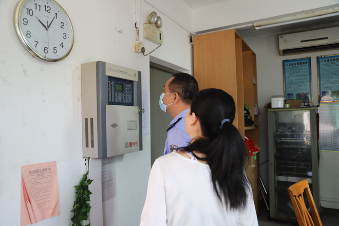 檢查組對(duì)學(xué)校消防設(shè)施進(jìn)行檢查